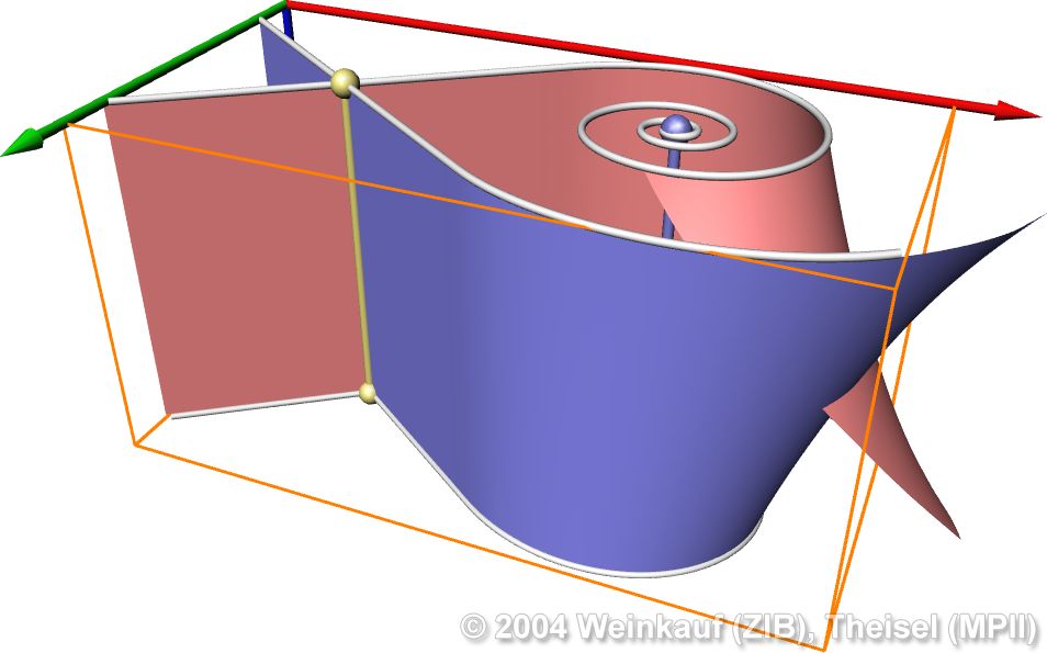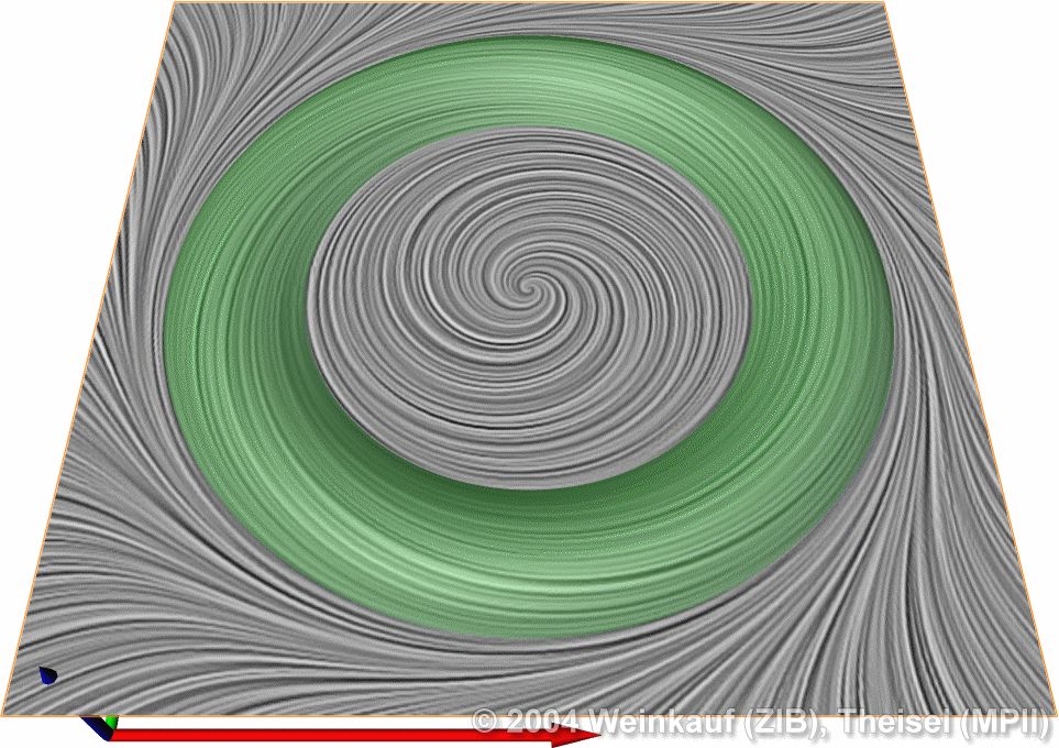 Topological methods aim at the segmentation of a vector field into areas of different flow behavior. For 2D time-dependent vector fields, two such segmentations are possible: either concerning the behavior of stream lines, or of path lines. While stream line oriented topology is well established, we introduce path line oriented topology as a new visualization approach in this paper. As a contribution to stream line oriented topology we introduce new methods to detect global bifurcations like saddle connections and cyclic fold bifurcations. To get the path line oriented topology we segment the vector field into areas of attracting, repelling and saddle-like behavior of the path lines. We compare both kinds of topologies and apply them to a number of data sets. | Stream Line and Path Line Oriented Topology for 2D Time-Dependent Vector Fields Proc. IEEE Visualization 2004, Austin, U.S.A., October 10 - 15, 2004 |