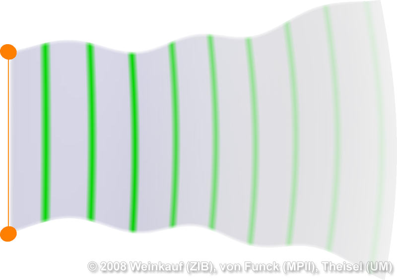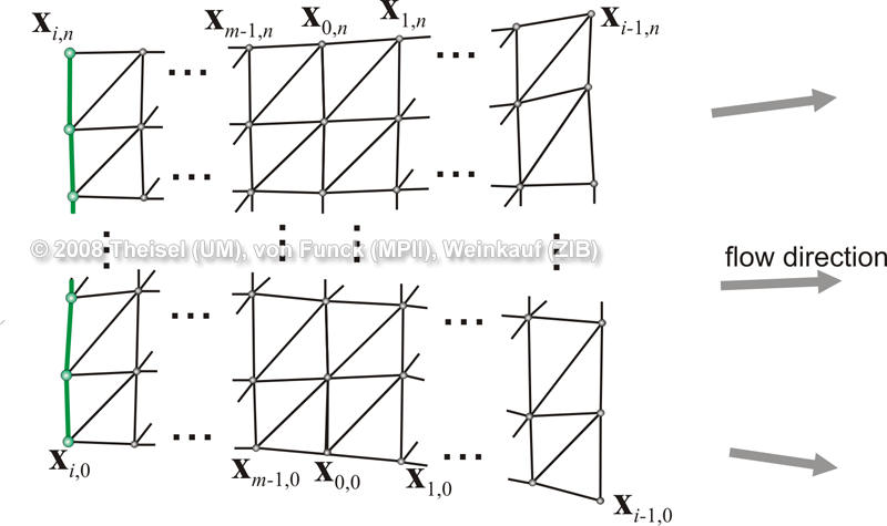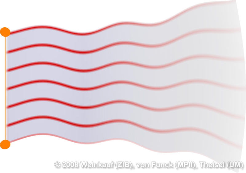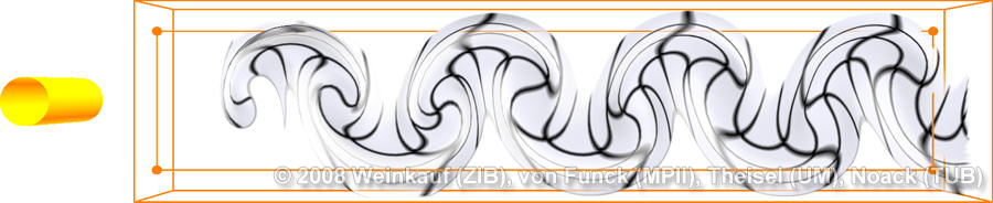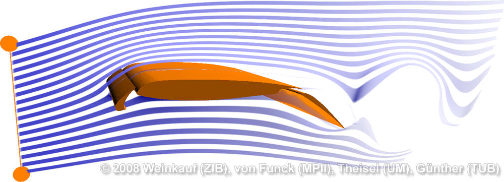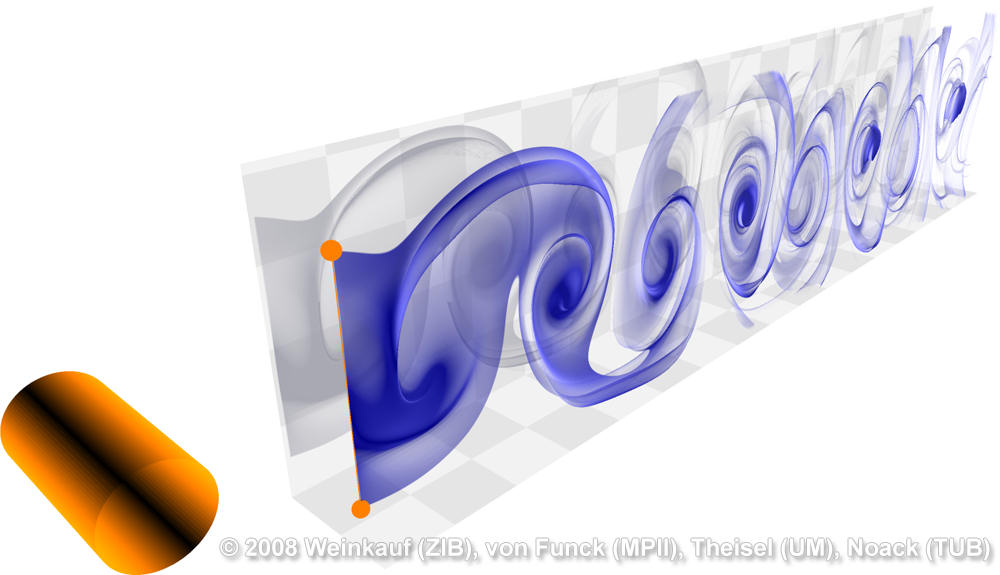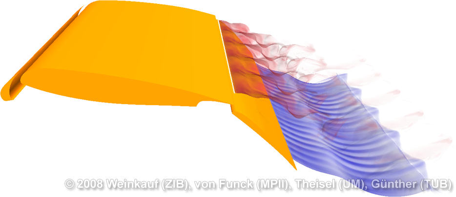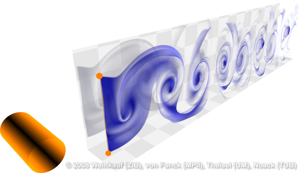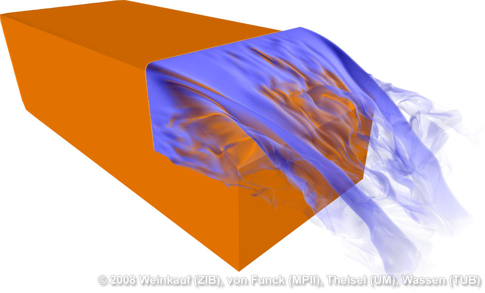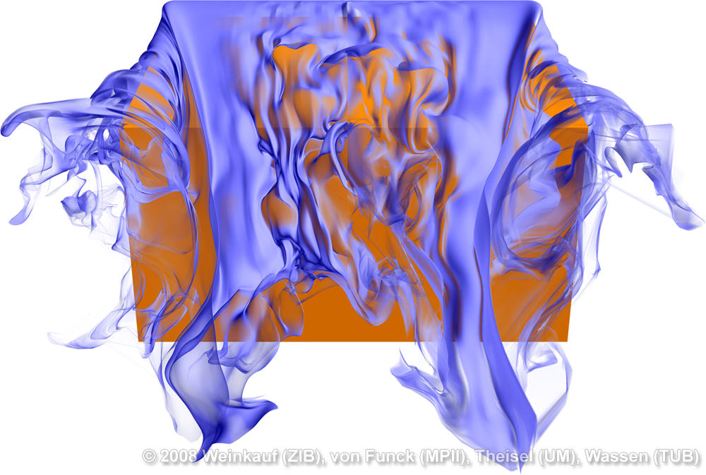 Smoke rendering is a standard technique for flow visualization. Most approaches are based on a volumetric, particle based, or image based representation of the smoke. This paper introduces an alternative representation of smoke structures: as semi-transparent streak surfaces. In order to make streak surface integration fast enough for interactive applications, we avoid expensive adaptive retriangulations by coupling the opacity of the triangles to their shapes. This way, the surface shows a smoke-like look even in rather turbulent areas. Furthermore, we show modifications of the approach to mimic smoke nozzles, wool tufts, and time surfaces. The technique is applied to a number of test data sets. | Smoke Surfaces: An Interactive Flow Visualization Technique Inspired by Real-World Flow Experiments IEEE Transactions on Visualization and Computer Graphics (Proceedings Visualization 2008) 14(6), November - December 2008 |