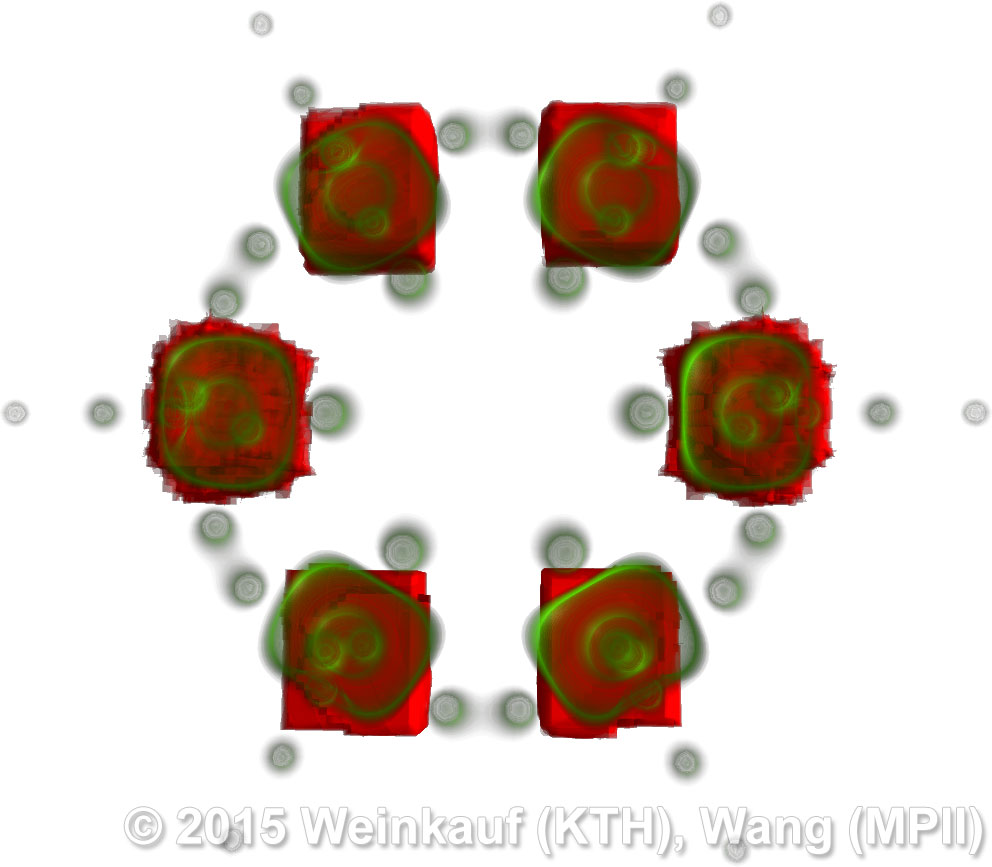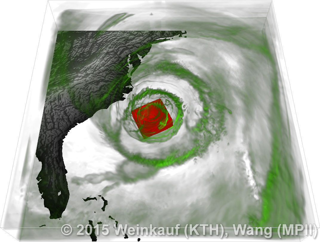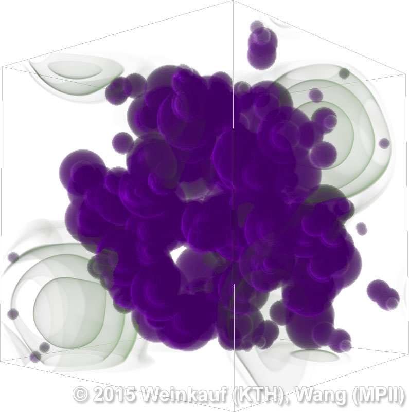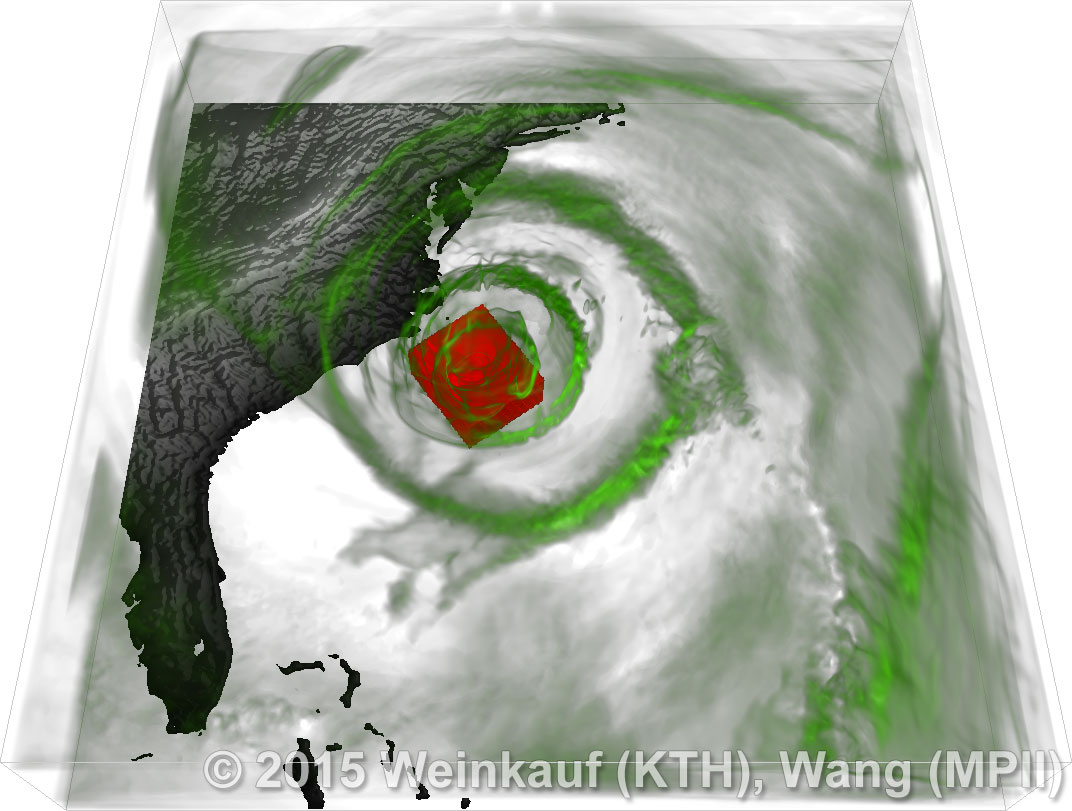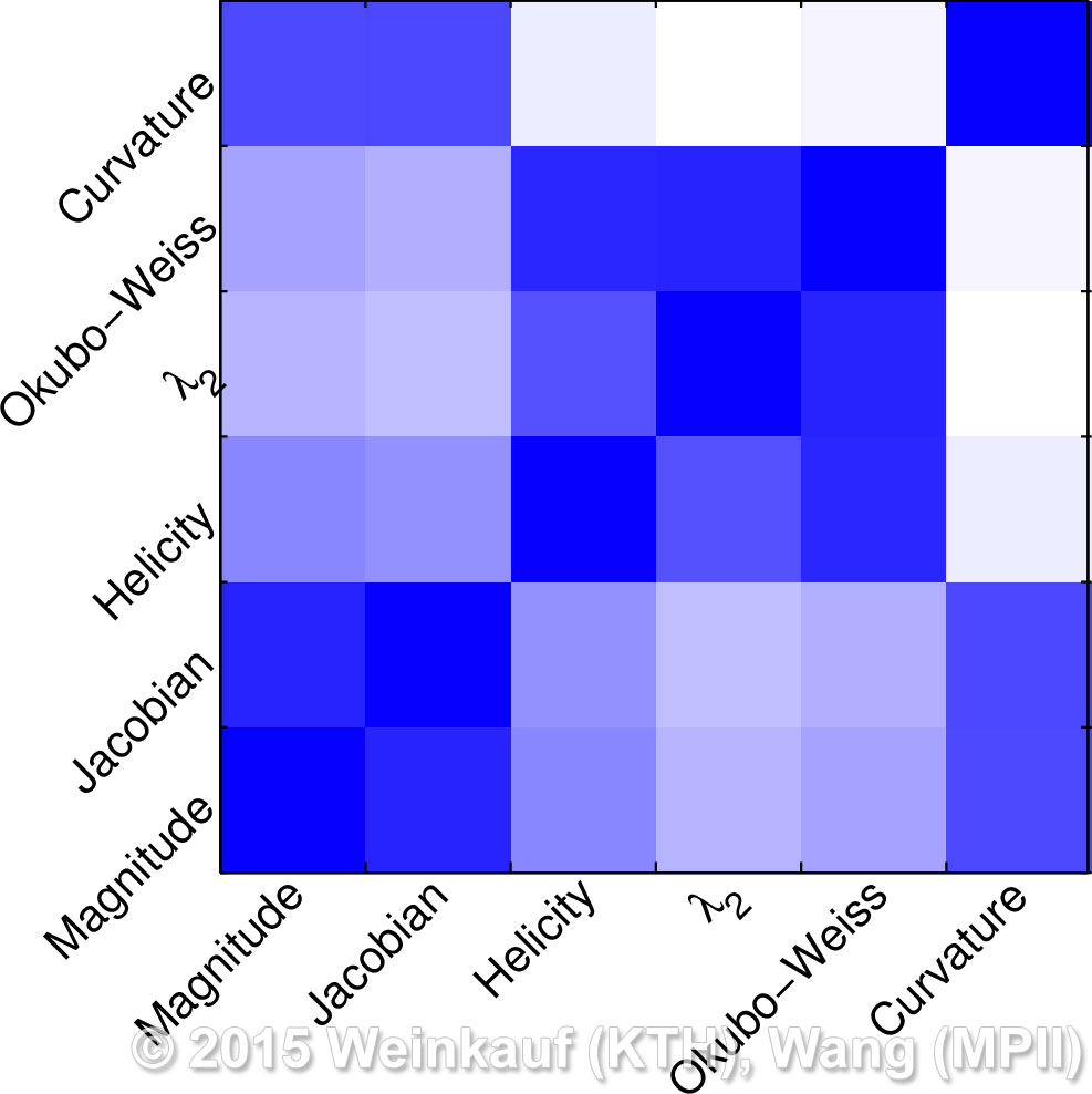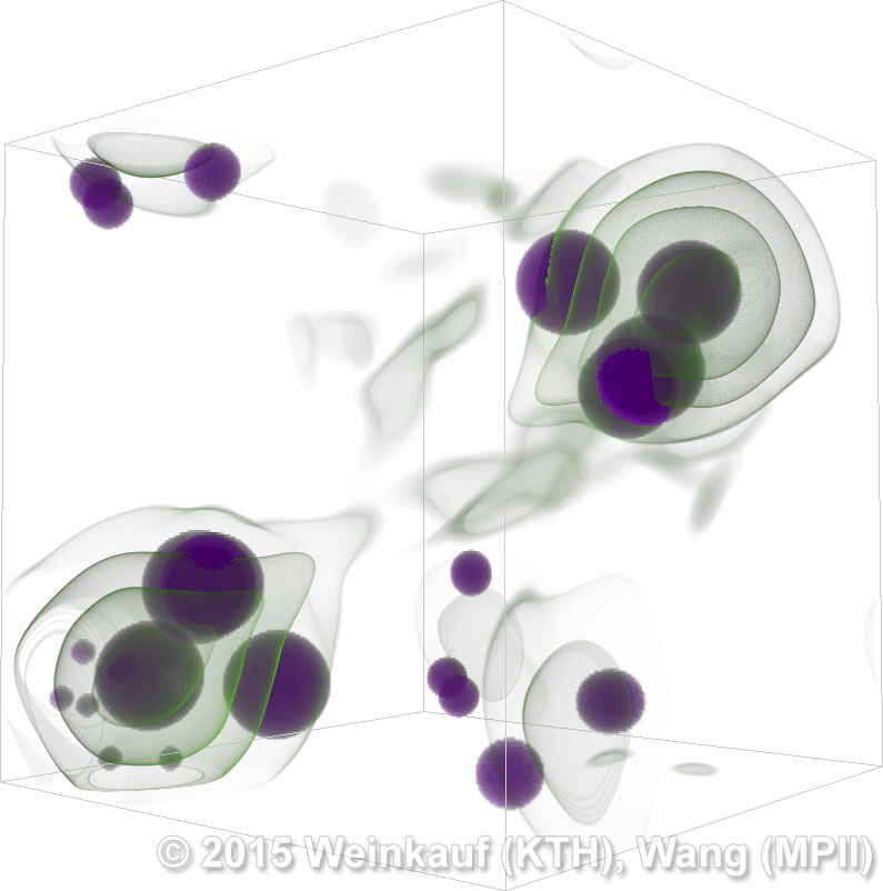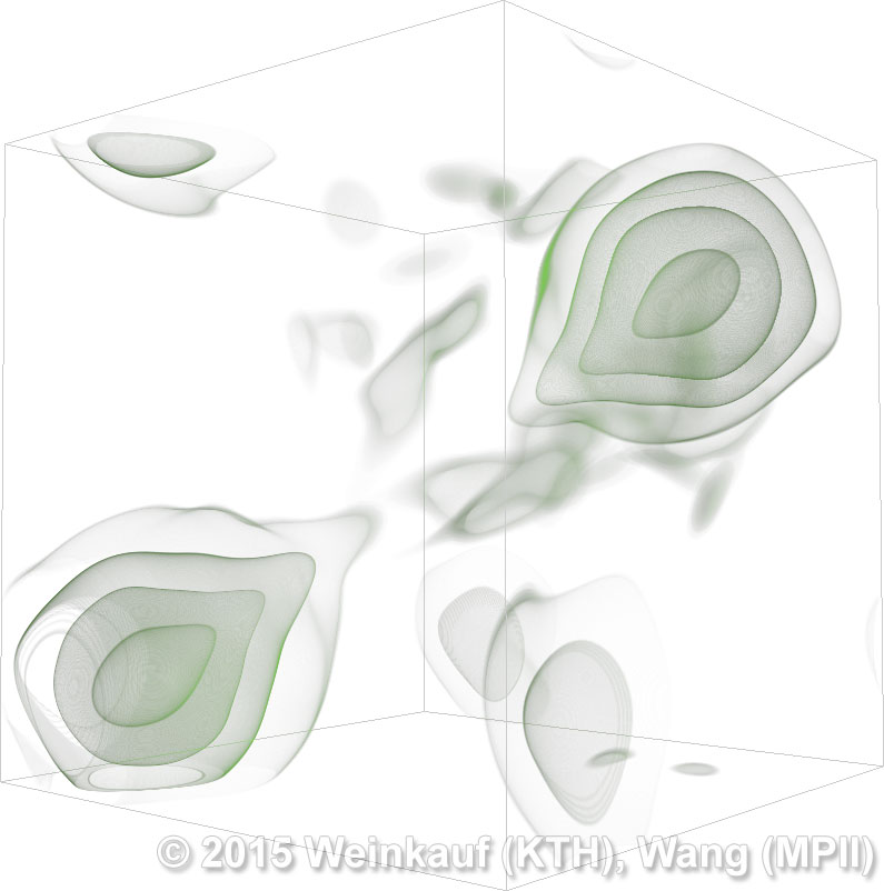 We present an approach to pattern matching in 3D multi-field scalar data. Existing pattern matching algorithms work on single scalar or vector fields only, yet many numerical simulations output multi-field data where only a joint analysis of multiple fields describes the underlying phenomenon fully. Our method takes this into account by bundling information from multiple fields into the description of a pattern. First, we extract a sparse set of features for each 3D scalar field using the 3D SIFT algorithm (Scale-Invariant Feature Transform). This allows for a memory-saving description of prominent features in the data with invariance to translation, rotation, and scaling. Second, the user defines a pattern as a set of SIFT features in multiple fields by e.g. brushing a region of interest. Third, we locate and rank matching patterns in the entire data set. Experiments show that our algorithm is efficient in terms of required memory and computational efforts. | Multi-field Pattern Matching based on Sparse Feature Sampling IEEE Transactions on Visualization and Computer Graphics (Proc. IEEE VIS) 22(1), January 2016 |