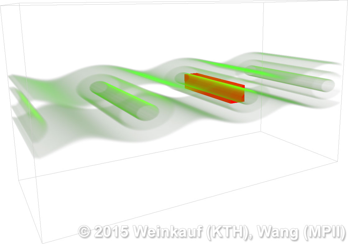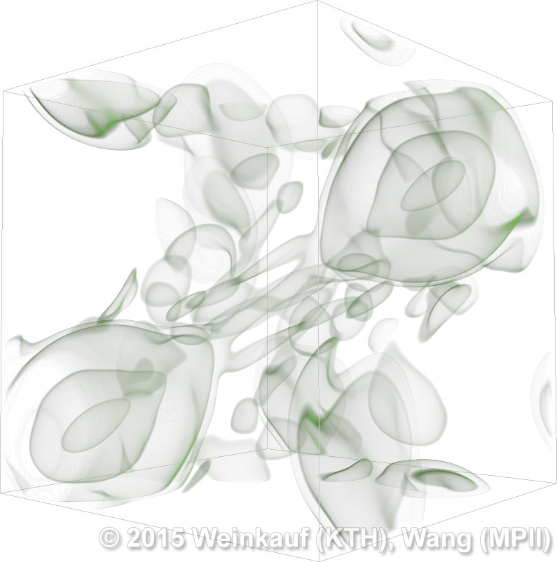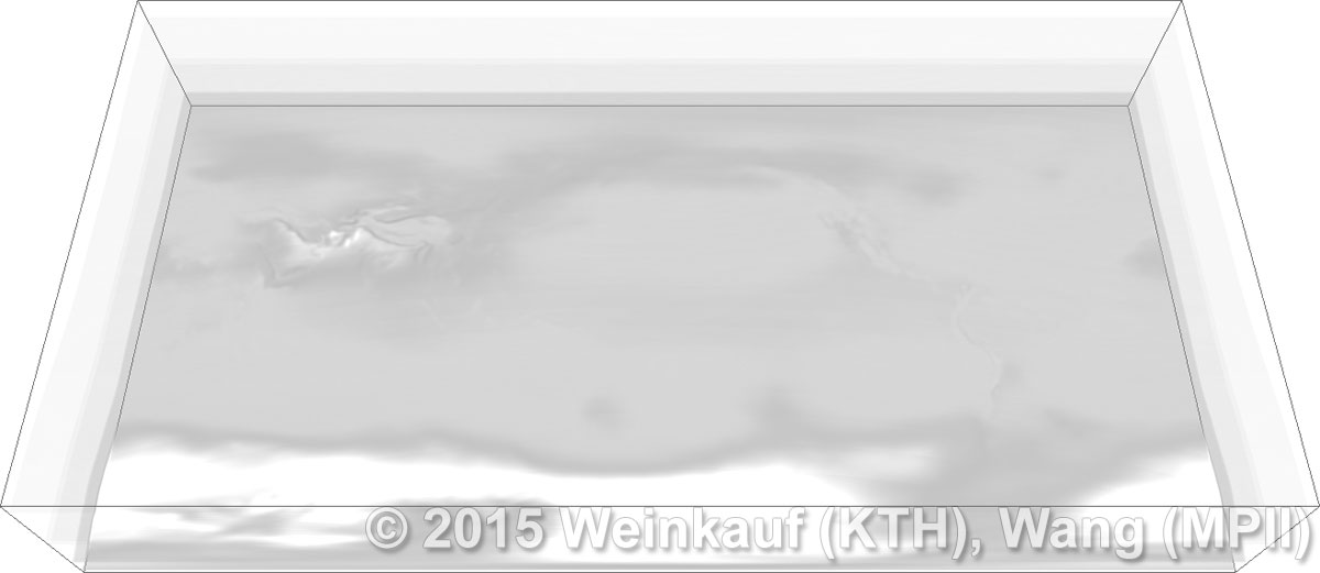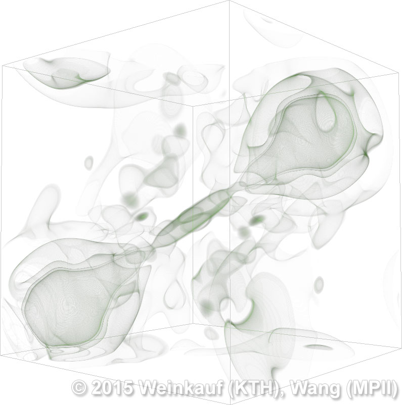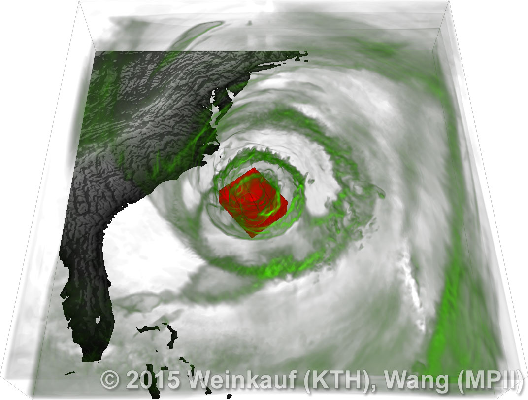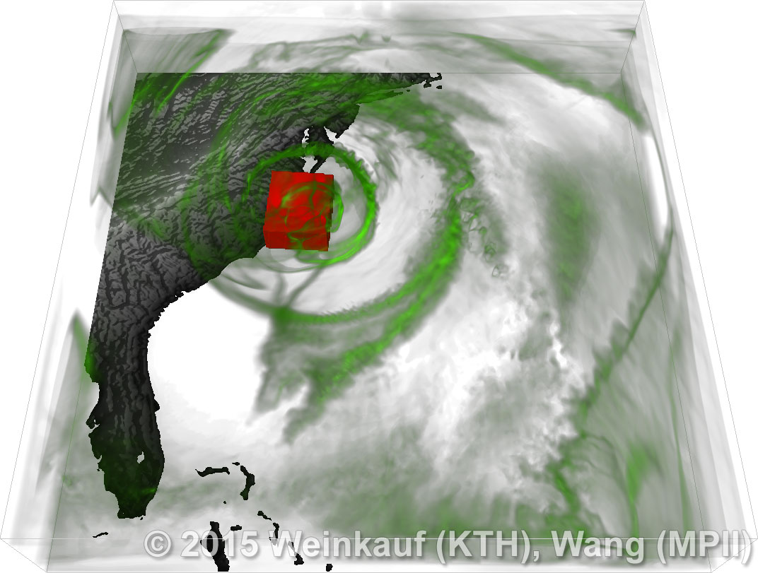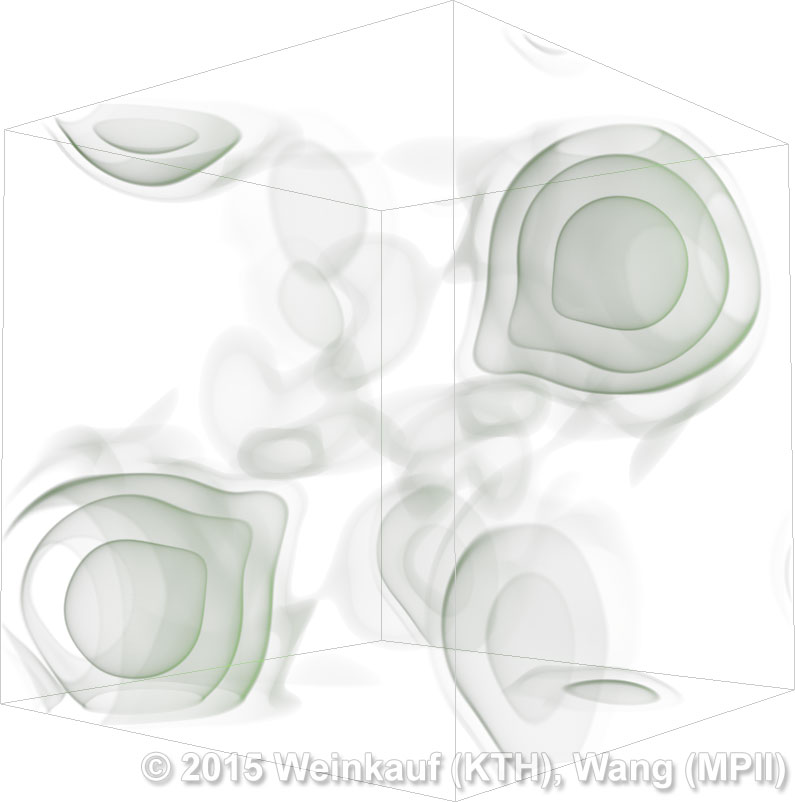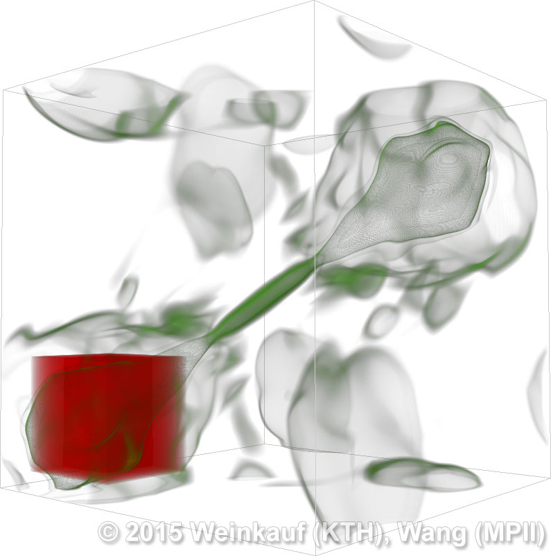 We present an approach to pattern matching in 3D multi-field scalar data. Existing pattern matching algorithms work on single scalar or vector fields only, yet many numerical simulations output multi-field data where only a joint analysis of multiple fields describes the underlying phenomenon fully. Our method takes this into account by bundling information from multiple fields into the description of a pattern. First, we extract a sparse set of features for each 3D scalar field using the 3D SIFT algorithm (Scale-Invariant Feature Transform). This allows for a memory-saving description of prominent features in the data with invariance to translation, rotation, and scaling. Second, the user defines a pattern as a set of SIFT features in multiple fields by e.g. brushing a region of interest. Third, we locate and rank matching patterns in the entire data set. Experiments show that our algorithm is efficient in terms of required memory and computational efforts. | Multi-field Pattern Matching based on Sparse Feature Sampling IEEE Transactions on Visualization and Computer Graphics (Proc. IEEE VIS) 22(1), January 2016 |