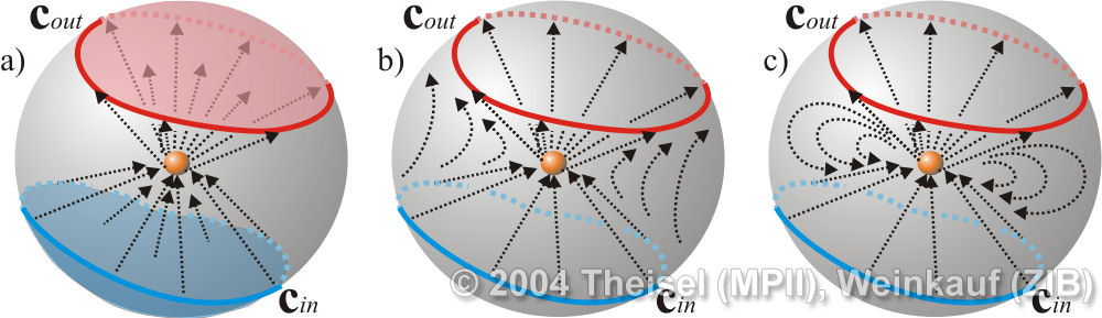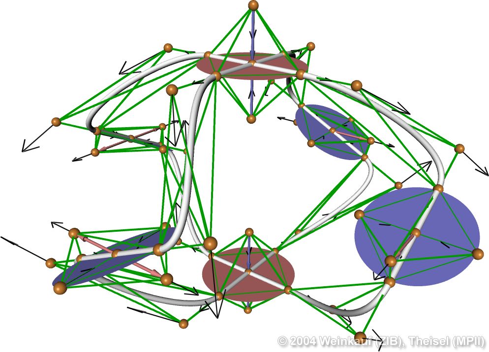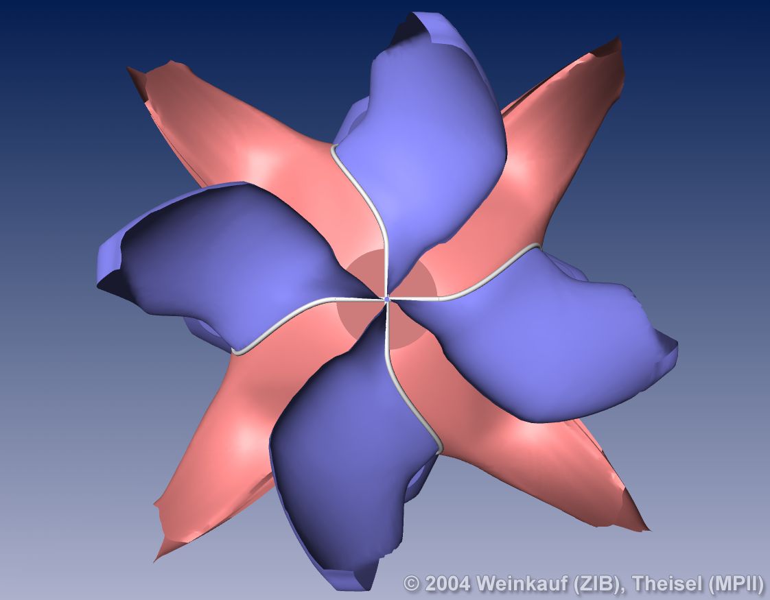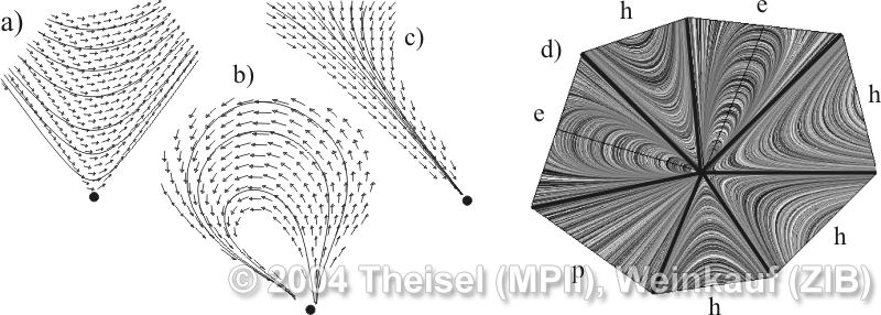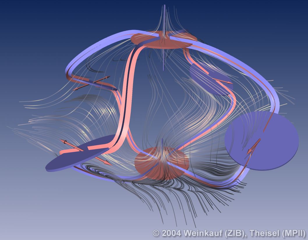We present the first algorithm for constructing 3D vector fields based on their topological skeleton. The skeleton itself is modeled by interactively moving a number of control polygons. Then a piecewise linear vector field is automatically constructed which has the same topological skeleton as modeled before. This approach is based on a complete segmentation of the areas around critical points into sectors of different flow behavior. Based on this, we present the first approach to visualizing higher order critical points of 3D vector fields. | Topological Construction and Visualization of Higher Order 3D Vector Fields Computer Graphics Forum (Proc. Eurographics) 23(3), September 2004 |