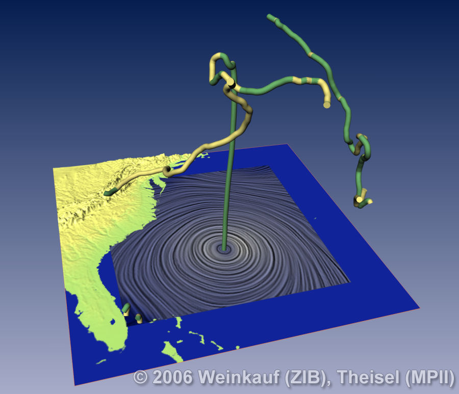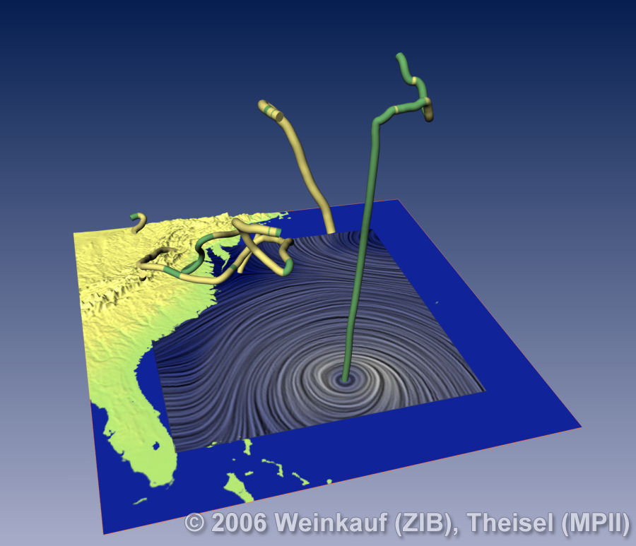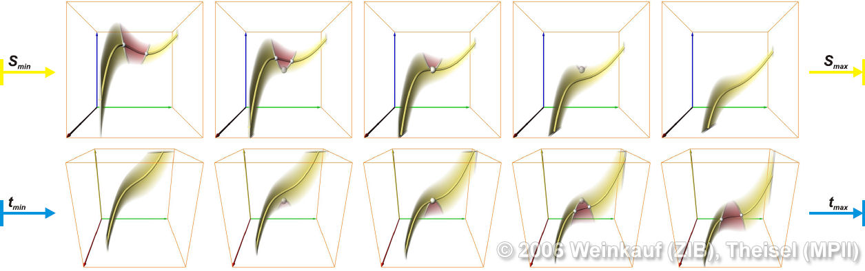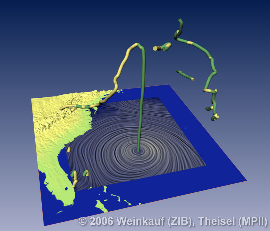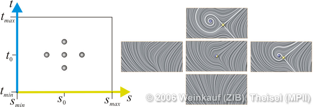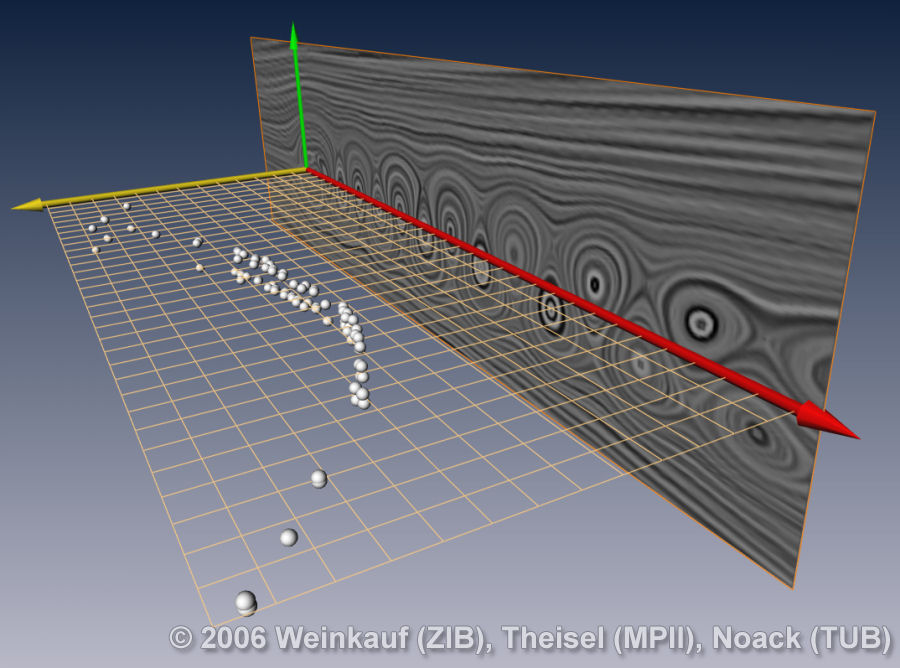 In this paper we extract and visualize the topological skeleton of two-parameter-dependent vector fields. This kind of vector data depends on two parameter dimensions, for instance physical time and a scale parameter. We show that two important classes of local bifurcations - fold and Hopf bifurcations - build line structures for which we present an approach to extract them. Furthermore we show that new kinds of structurally stable local bifurcations exist for this data, namely fold-fold and Hopf-fold bifurcations. We present a complete classification of them. We apply our topological extraction method to analyze a number of two-parameter-dependent vector fields with different physical interpretations of the two additional dimensions. | Topological Structures in Two-Parameter-Dependent 2D Vector Fields Computer Graphics Forum (Proc. Eurographics) 25(3), September 2006 |