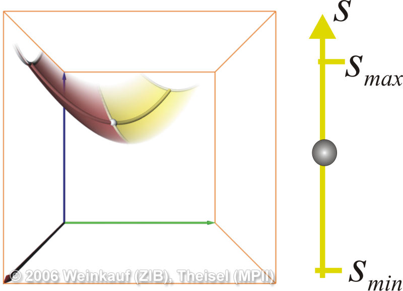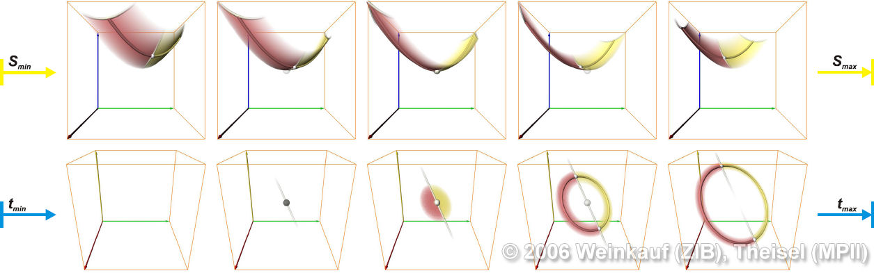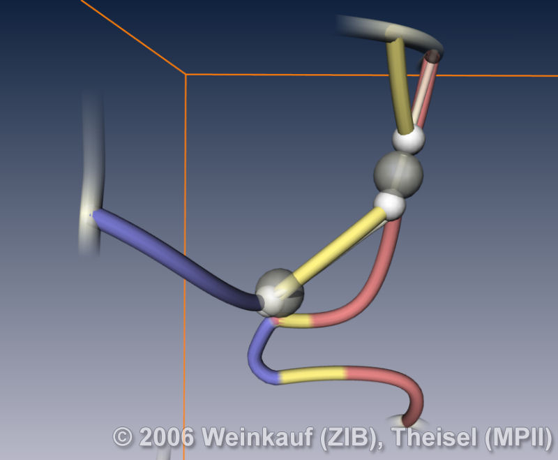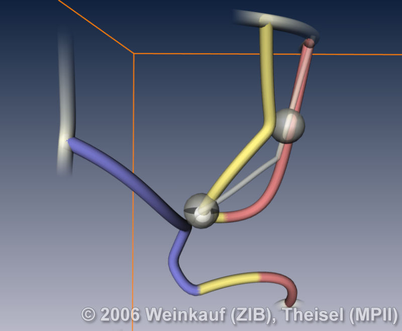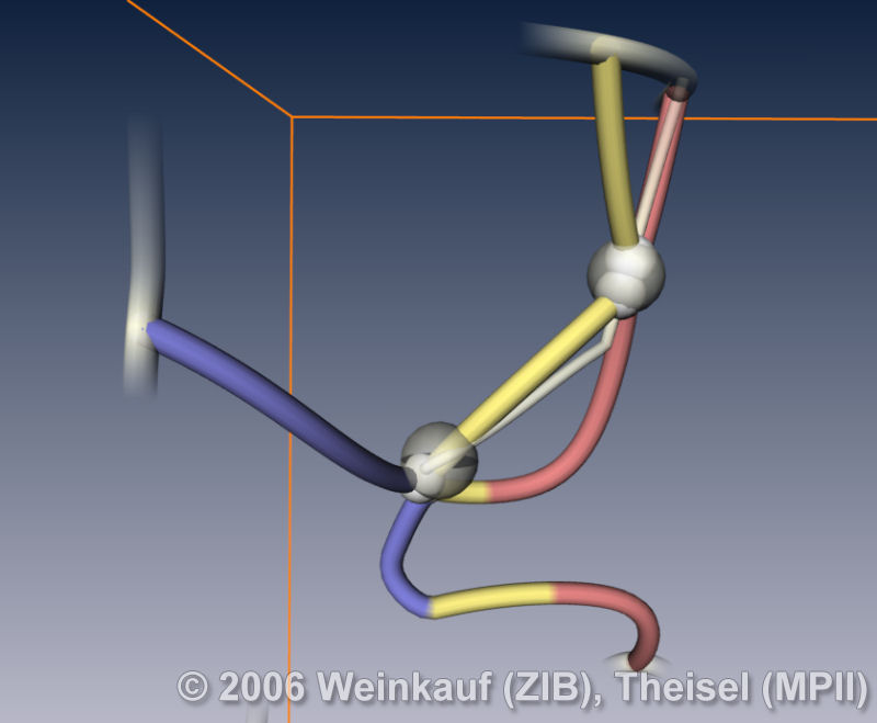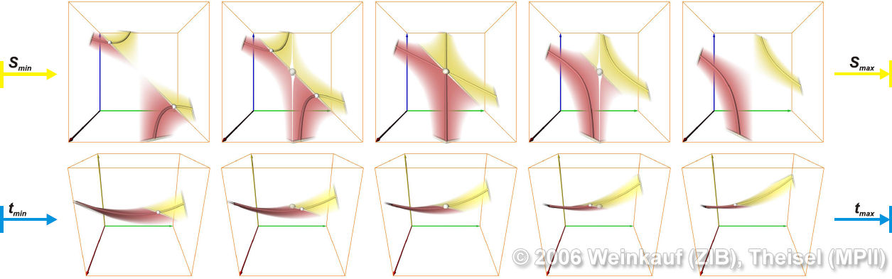 In this paper we extract and visualize the topological skeleton of two-parameter-dependent vector fields. This kind of vector data depends on two parameter dimensions, for instance physical time and a scale parameter. We show that two important classes of local bifurcations - fold and Hopf bifurcations - build line structures for which we present an approach to extract them. Furthermore we show that new kinds of structurally stable local bifurcations exist for this data, namely fold-fold and Hopf-fold bifurcations. We present a complete classification of them. We apply our topological extraction method to analyze a number of two-parameter-dependent vector fields with different physical interpretations of the two additional dimensions. | Topological Structures in Two-Parameter-Dependent 2D Vector Fields Computer Graphics Forum (Proc. Eurographics) 25(3), September 2006 |