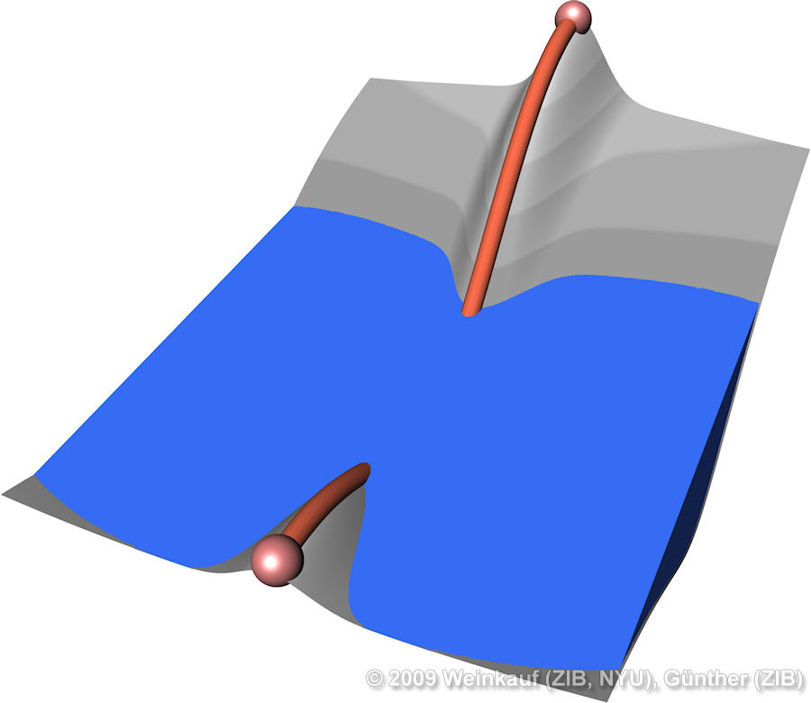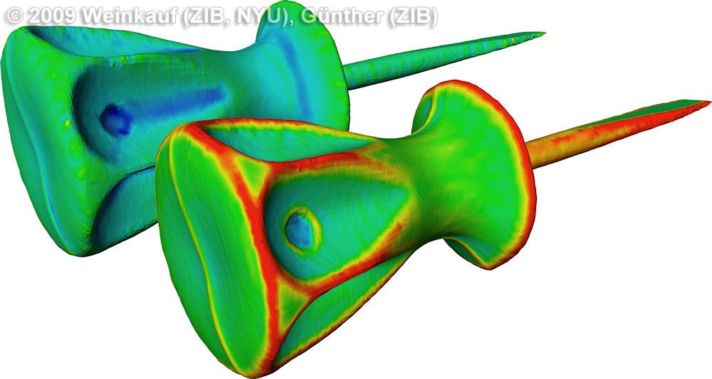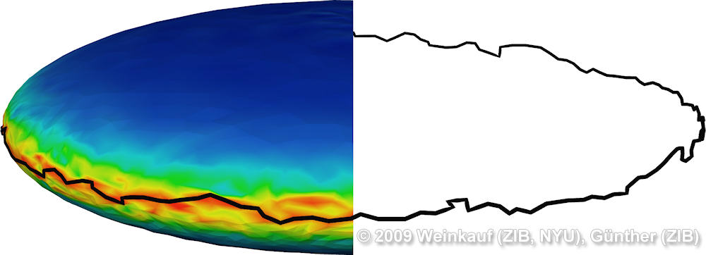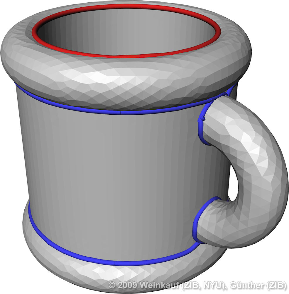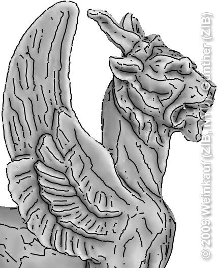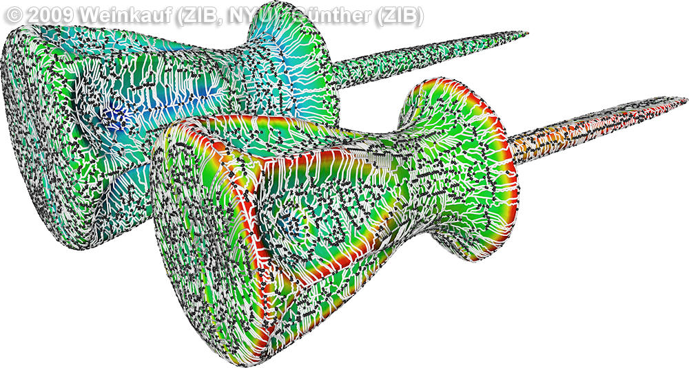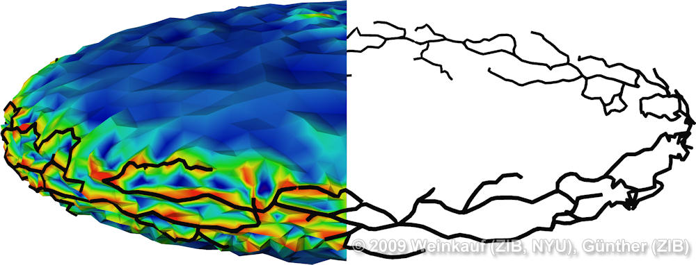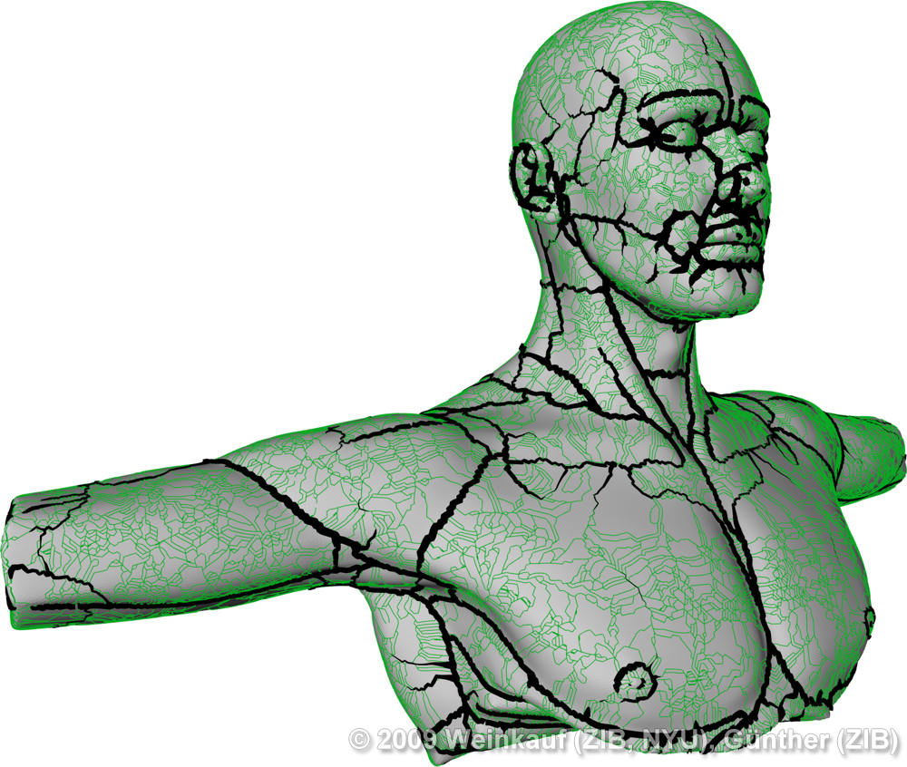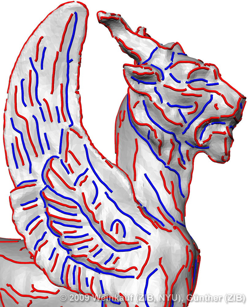 Salient edges are perceptually prominent features of a surface. Most previous extraction schemes utilize the notion of ridges and valleys for their detection, thereby requiring curvature derivatives which are rather sensitive to noise. We introduce a novel method for salient edge extraction which does not depend on curvature derivatives. It is based on a topological analysis of the principal curvatures and salient edges of the surface are identified as parts of separatrices of the topological skeleton. Previous topological approaches obtain results including non-salient edges due to inherent properties of the underlying algorithms. We extend the profound theory by introducing the novel concept of separatrix persistence, which is a smooth measure along a separatrix and allows to keep its most salient parts only. We compare our results with other methods for salient edge extraction. | Separatrix Persistence: Extraction of Salient Edges on Surfaces Using Topological Methods Computer Graphics Forum (Proc. SGP '09) 28(5), July 2009 |