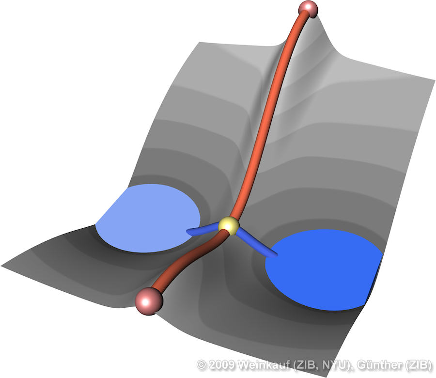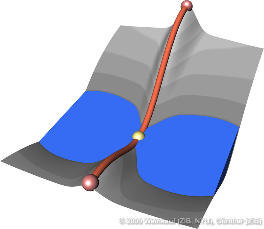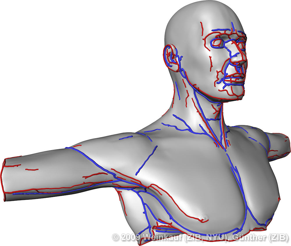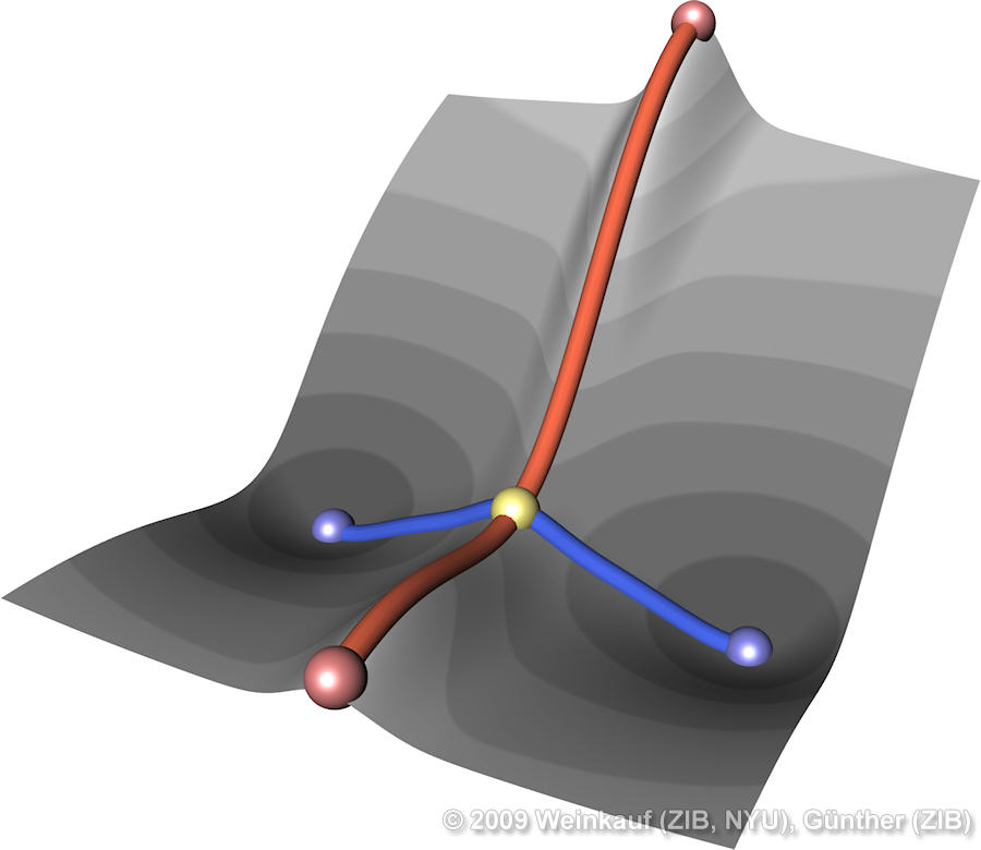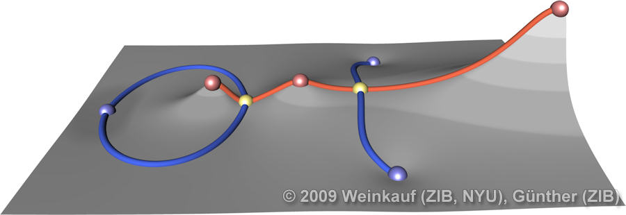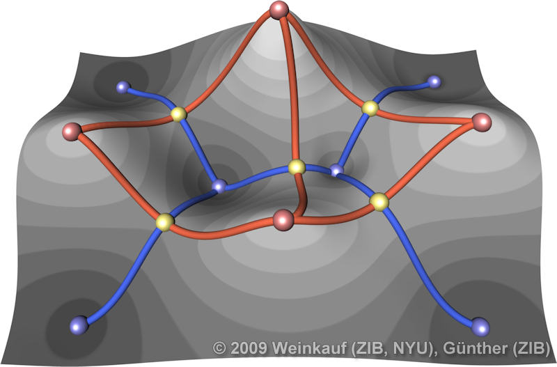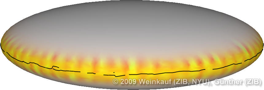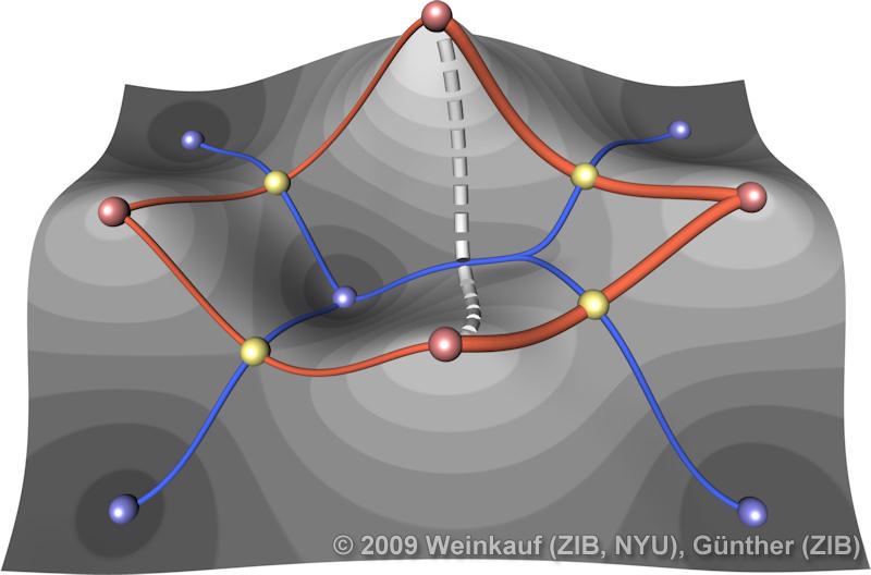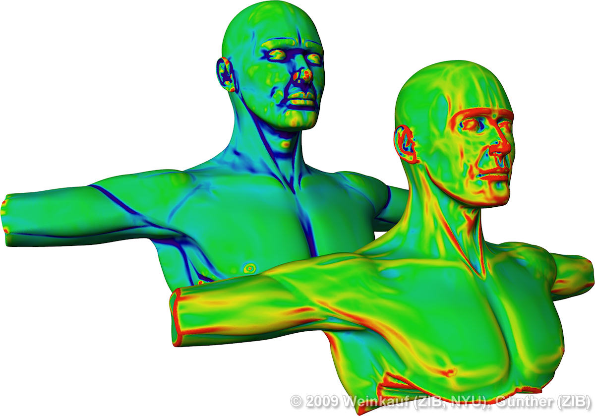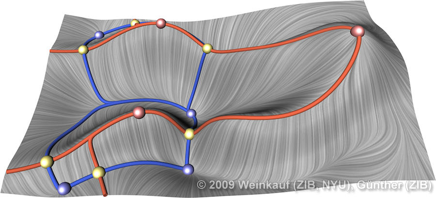 Salient edges are perceptually prominent features of a surface. Most previous extraction schemes utilize the notion of ridges and valleys for their detection, thereby requiring curvature derivatives which are rather sensitive to noise. We introduce a novel method for salient edge extraction which does not depend on curvature derivatives. It is based on a topological analysis of the principal curvatures and salient edges of the surface are identified as parts of separatrices of the topological skeleton. Previous topological approaches obtain results including non-salient edges due to inherent properties of the underlying algorithms. We extend the profound theory by introducing the novel concept of separatrix persistence, which is a smooth measure along a separatrix and allows to keep its most salient parts only. We compare our results with other methods for salient edge extraction. | Separatrix Persistence: Extraction of Salient Edges on Surfaces Using Topological Methods Computer Graphics Forum (Proc. SGP '09) 28(5), July 2009 |