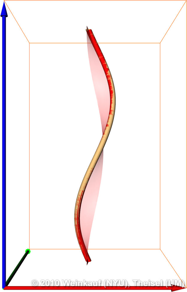 The cores of swirling streak lines (red) detect the attractor (yellow) in the Beads Problem flow in contrast to the core lines of stream (green) and path lines (blue). The streak line core is a 4D surface shown in the right image together with its intersection at τ = -9, which is a line in space-time that matches the attractor of this flow.