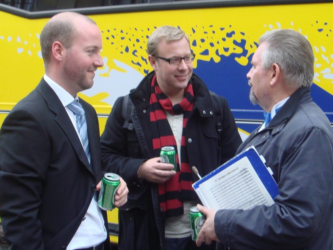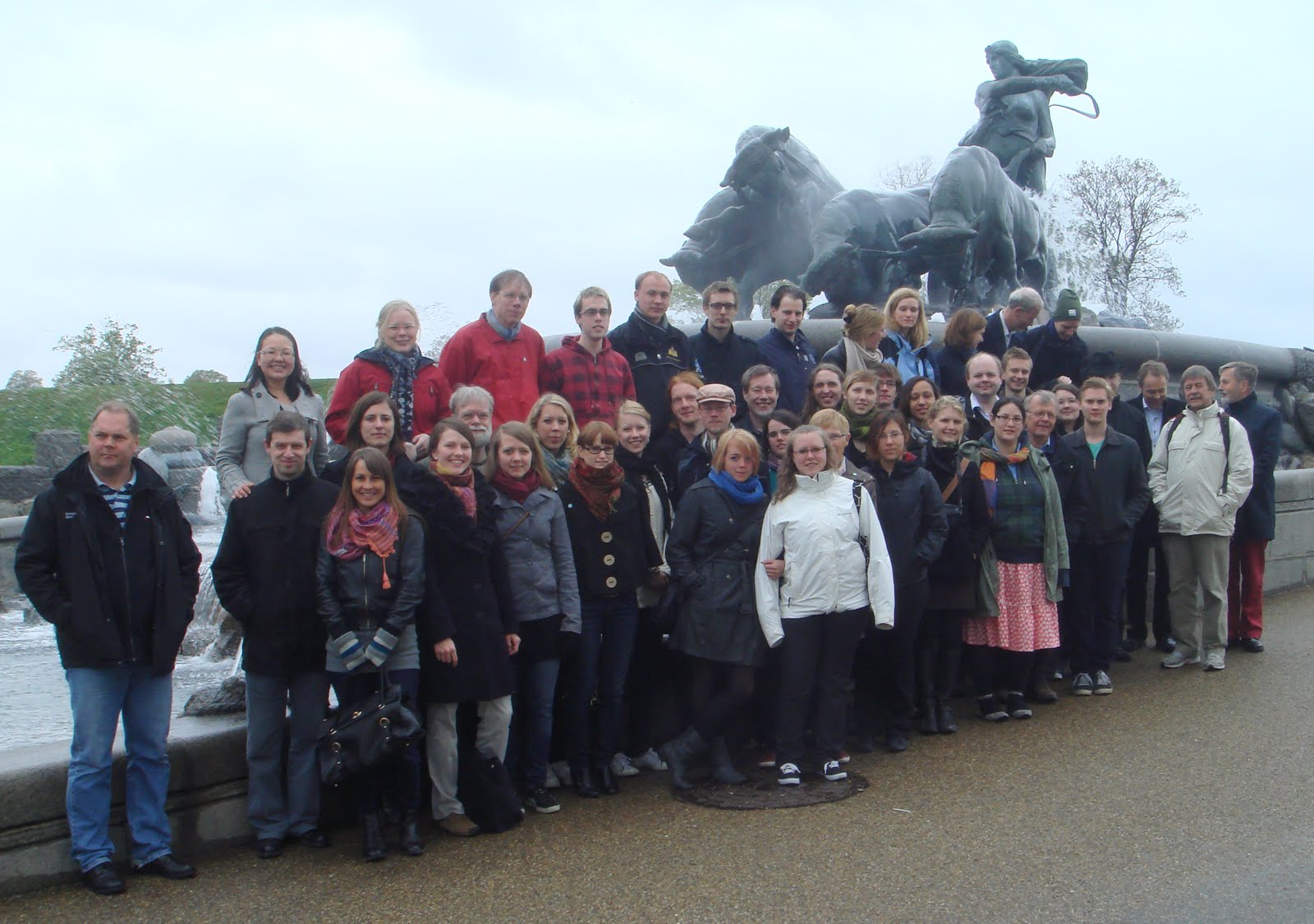 Framåt tio på kvällen kom vi fram till planen utanför Köpenhamns Universitets festsal. Blixtsnabb urlastning av notställslådor och stora instrument, in med allt i den magnifika festsalen där Gunnar och laståsnorna möttes av universitetsorkestern SymfUnis dirigent Kristoffer Kaas. Sedan vidare till Hotell Absalon (med förmaningar från Mats att inte gå ut ensamma nattetid eftersom hotellet ligger vid Istedgade, Köpenhamns "red-light-district"). Incheckningen gick snabbt och trötta men nöjda efter den långa bussresan sov vi gott i våra två- eller trebäddsrum.