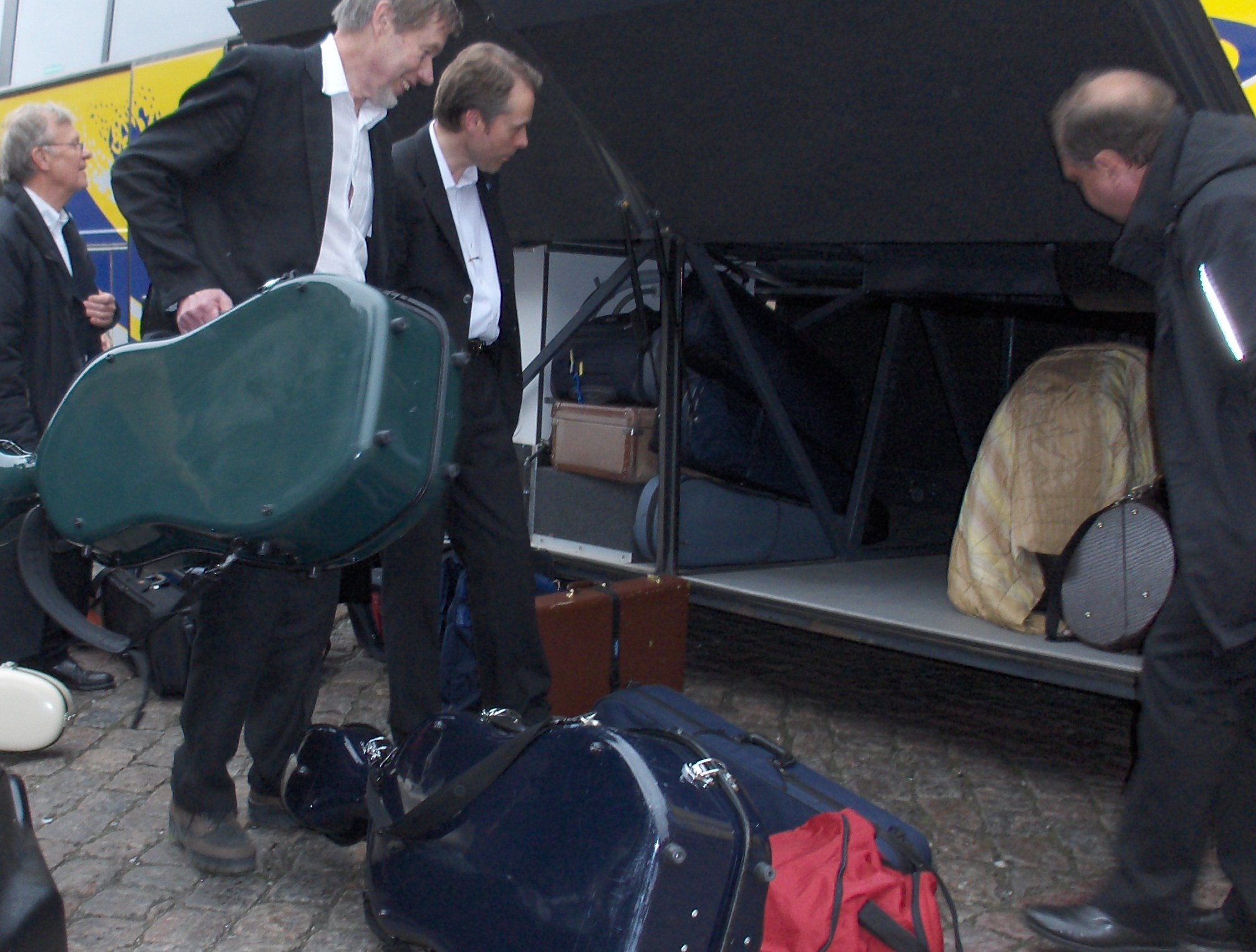 Första stoppet var i småländska Klevshult, matpaus med fritt val från middagsbuffén - en välsmakande spätta med stuvad spenat för min del. Den ende som inte fick lugn och ro vid maten var Gunnar som hade fullt sjå med att telefonledes försöka ragga upp en förstafagottist. Efter många mobilsamtal fick han tag på en som kunde spela vid lördagens Köpenhamnskonsert (men inte repetera mer än en kvart) och en annan fagottist till söndagens Malmökonsert.
