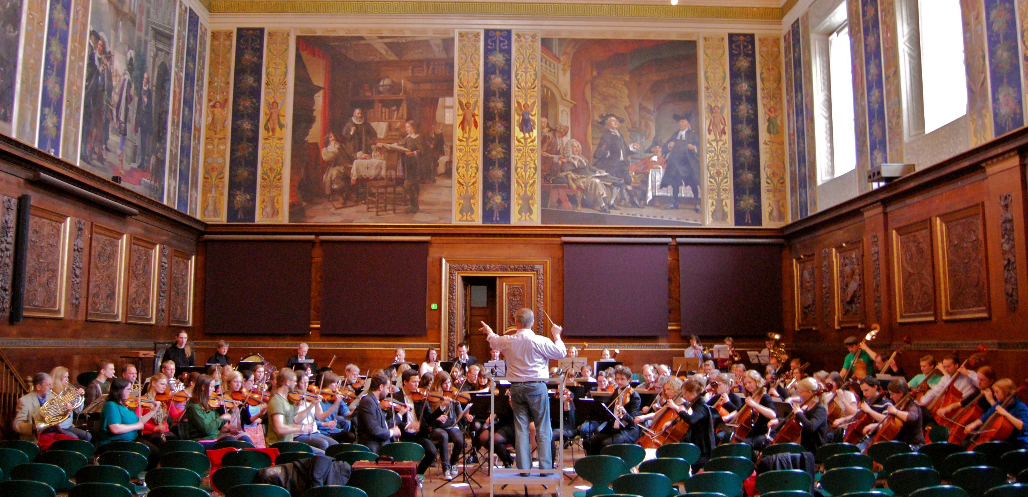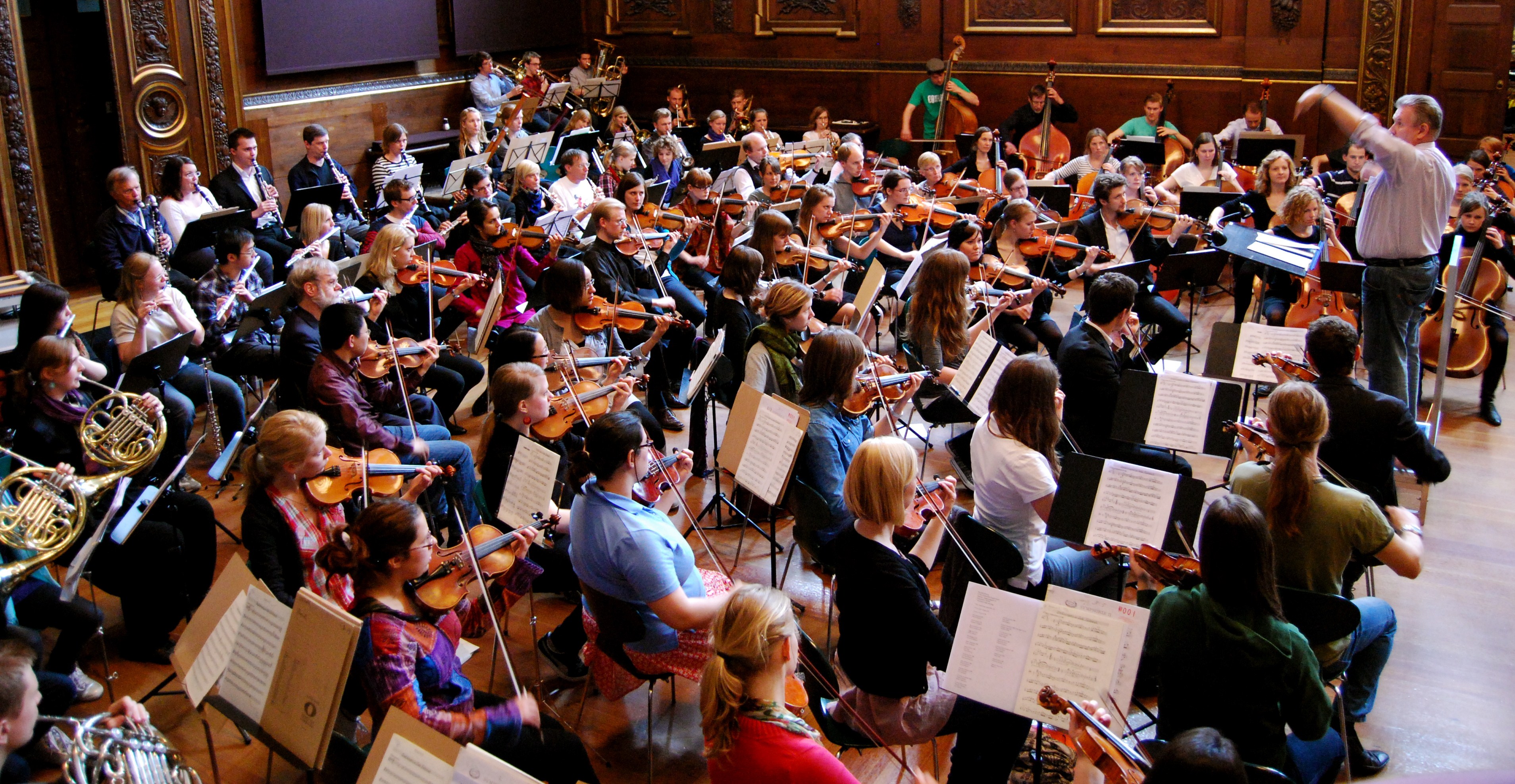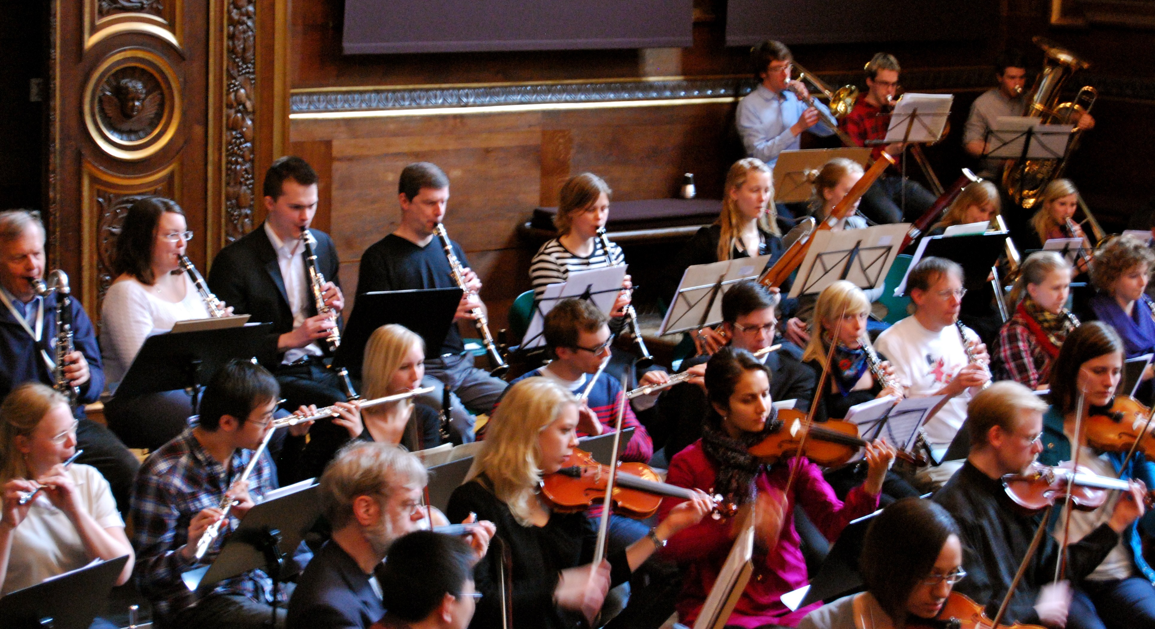 KTHAK smög tyst in till festsalens sidorum för att inte störa danska universitetsorkestern SymfUni och Kristoffer Kaas som höll på att repetera Griegs Symfoniska danser. SymfUni bildades 2007 och har bara drygt trettio medlemmar. Fler skulle behövas för att göra Griegverket full rättvisa. Med kort varsel fick Göran och Karl hoppa in på puka och slagverk.