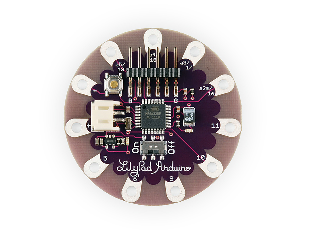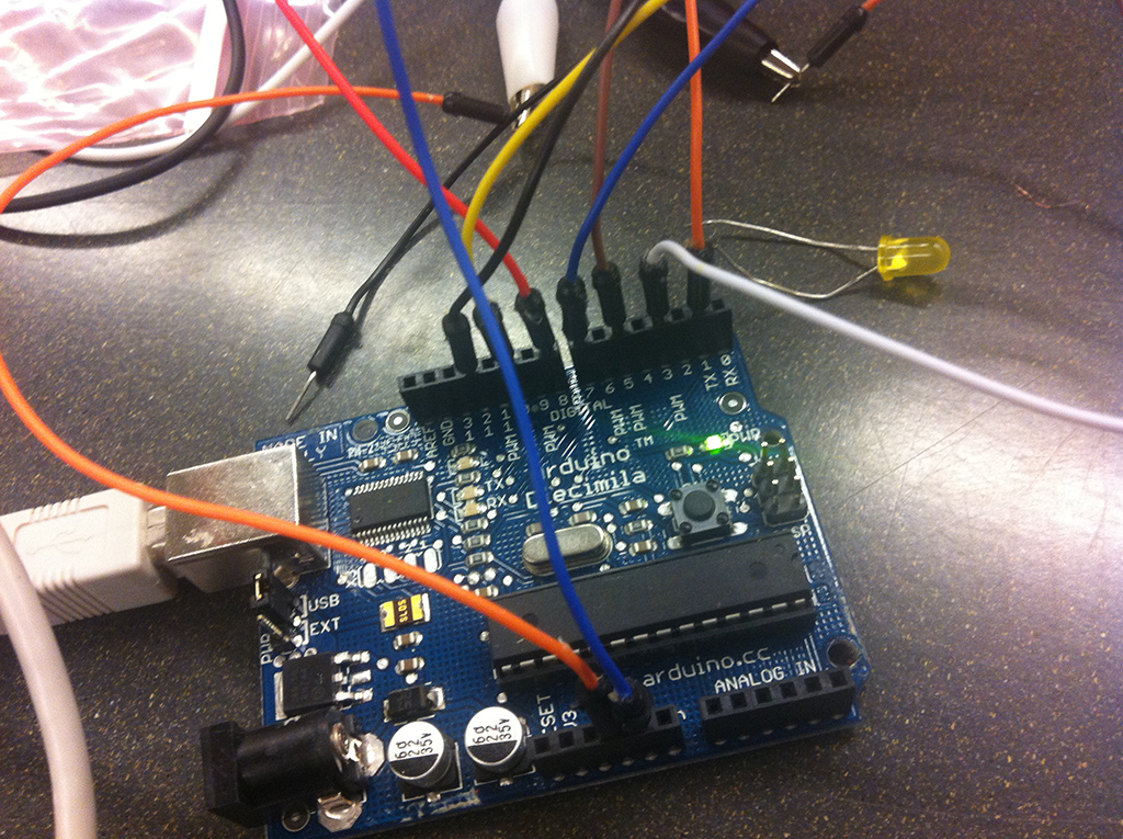 Before uploading the final program to the Lilypad (right), the software was tested and tweaked several times to get the right tones and delays we wanted. This was done on a Arduino Diecimila (left), because of the big and simple connectors on the boards sides compared to the Lilypad’s connectors, which require crocodile cables, tape, glue, or soldering.